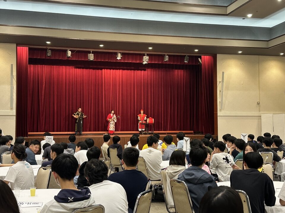夕方頃ホテルに到着し、夕食の後は沖縄の伝統芸能・エイサーの演舞を鑑賞。太鼓の迫力ある音と力強い踊りに、生徒たちから自然と拍手が起こり、笑顔が溢れる時間となりました。