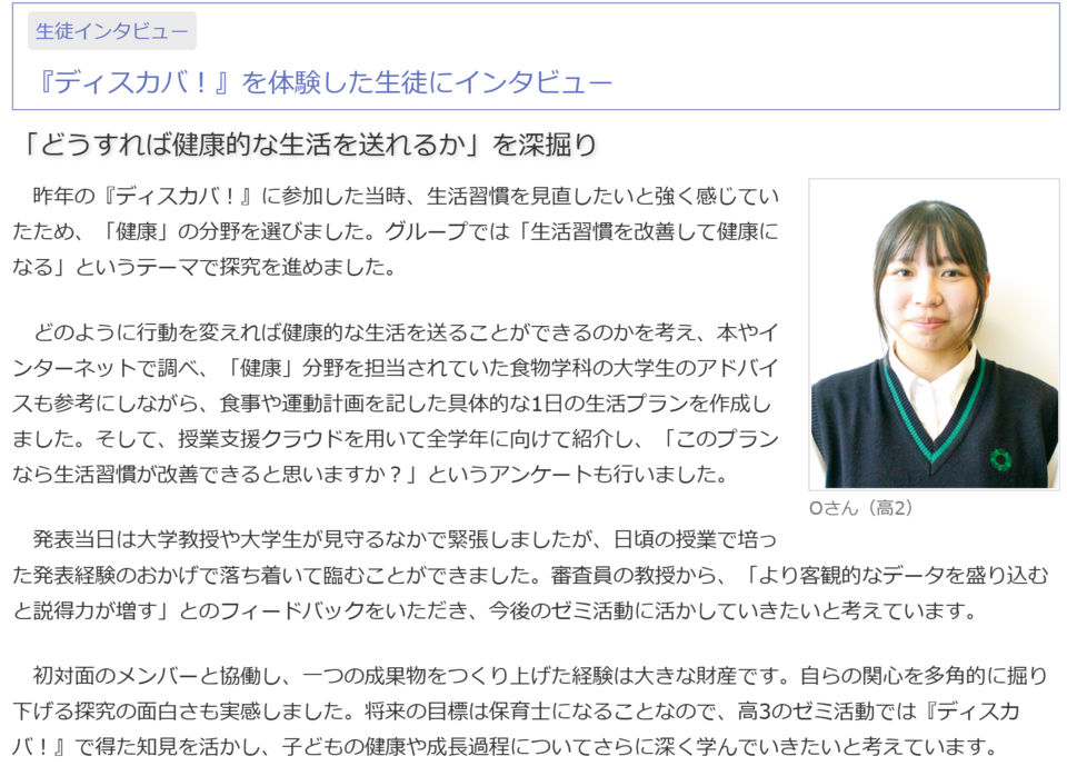 が紹介されています。大学生や教授との協働を通じて、課題設定から調査・発表に至るまで主体的に取り組む姿が取り上げられ、まさに上野学園が大切にしている 「探究学習」の実践例として紹介されています。