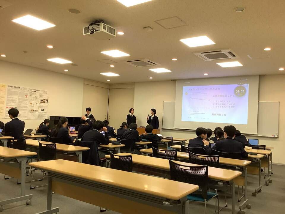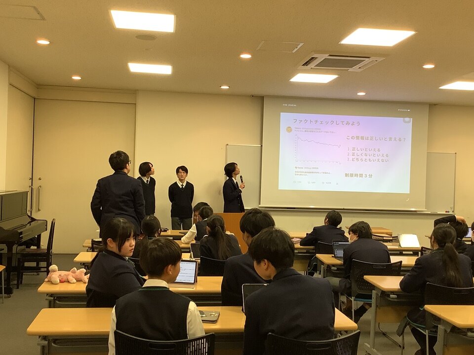 2月4日(水)探究活動の一環として、高校2年A組碇谷琉大さん、倉田一輝さん、湯浅颯斗さんによる「ファクトチェックを用いた新たな情報リテラシー」の授業を受講しました。この授業実践と振り返りの報告を「学びの協奏コンテスト」の最終審査会で発表する予定です。「学びの協奏コンテスト」では、新たな形の情報リテラシーを学ぶことができる授業の提案をすることが目的となっています。